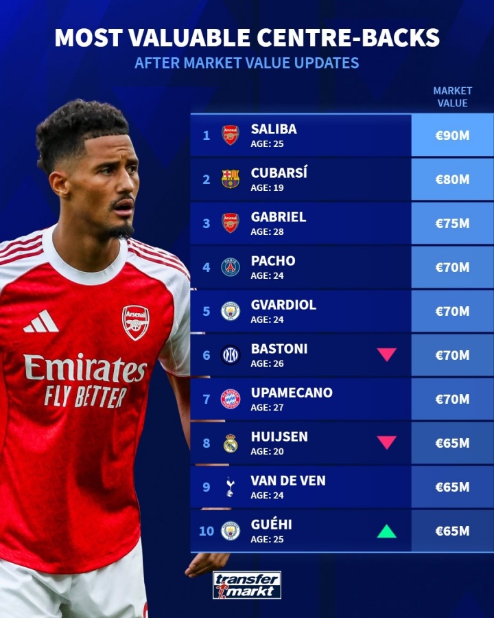 4月7日讯 德国转会市场公布了最新的足坛中卫身价排行榜,其中阿森纳中卫萨利巴以9000万欧元,高居榜首。
